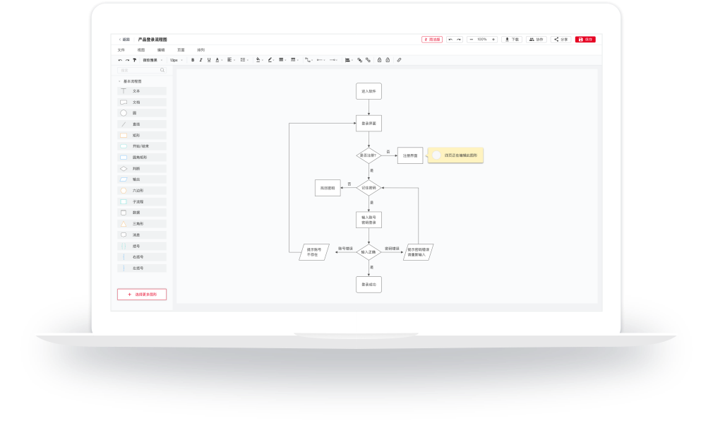 在AlphaChart中每個符號都是矢量的,可以填充顏色,改變大小,定義數據和連接。在流程圖標準符號包括4個基本流程符號橢圓形、矩形、箭頭、菱形和5類中高級的流程圖符號。通用流程圖